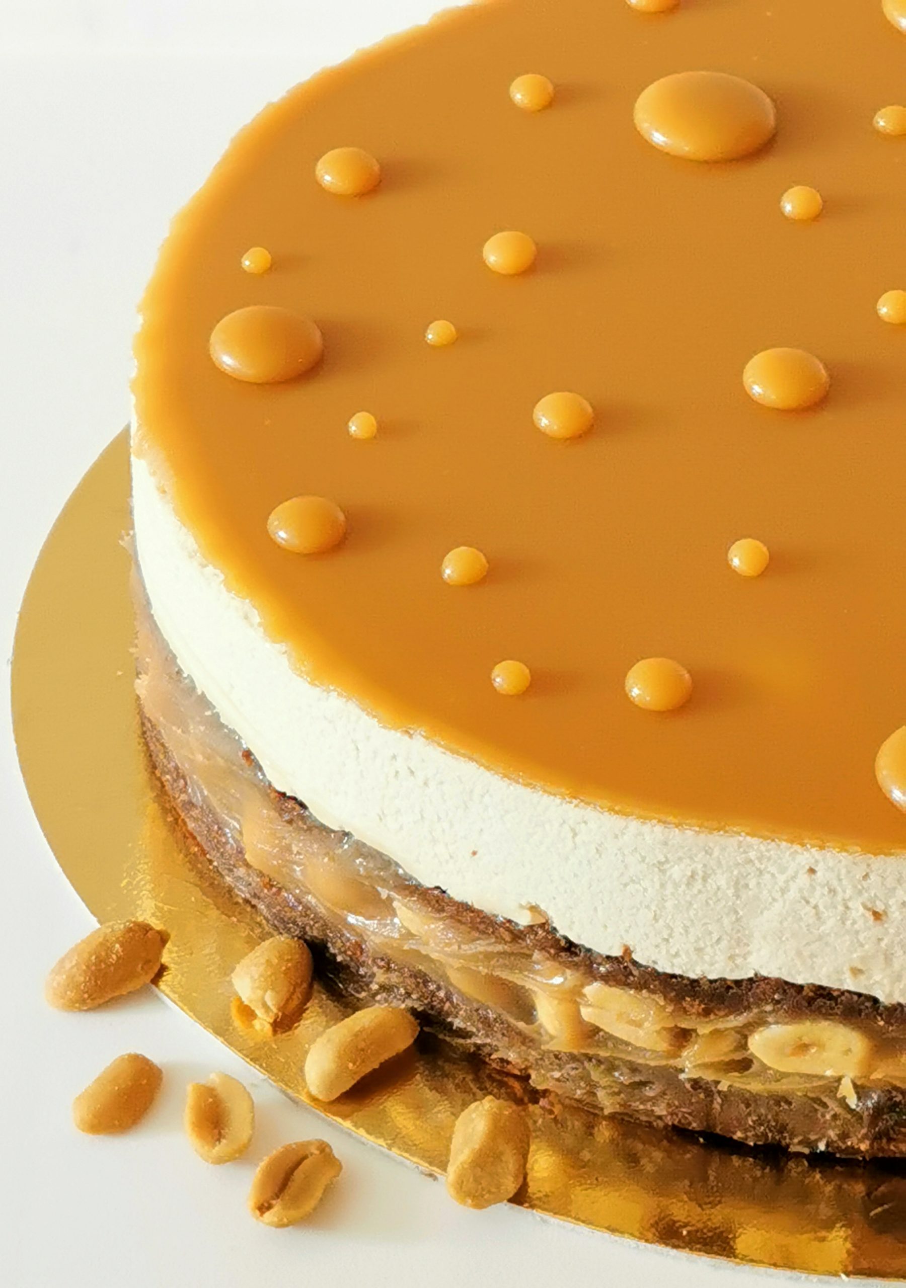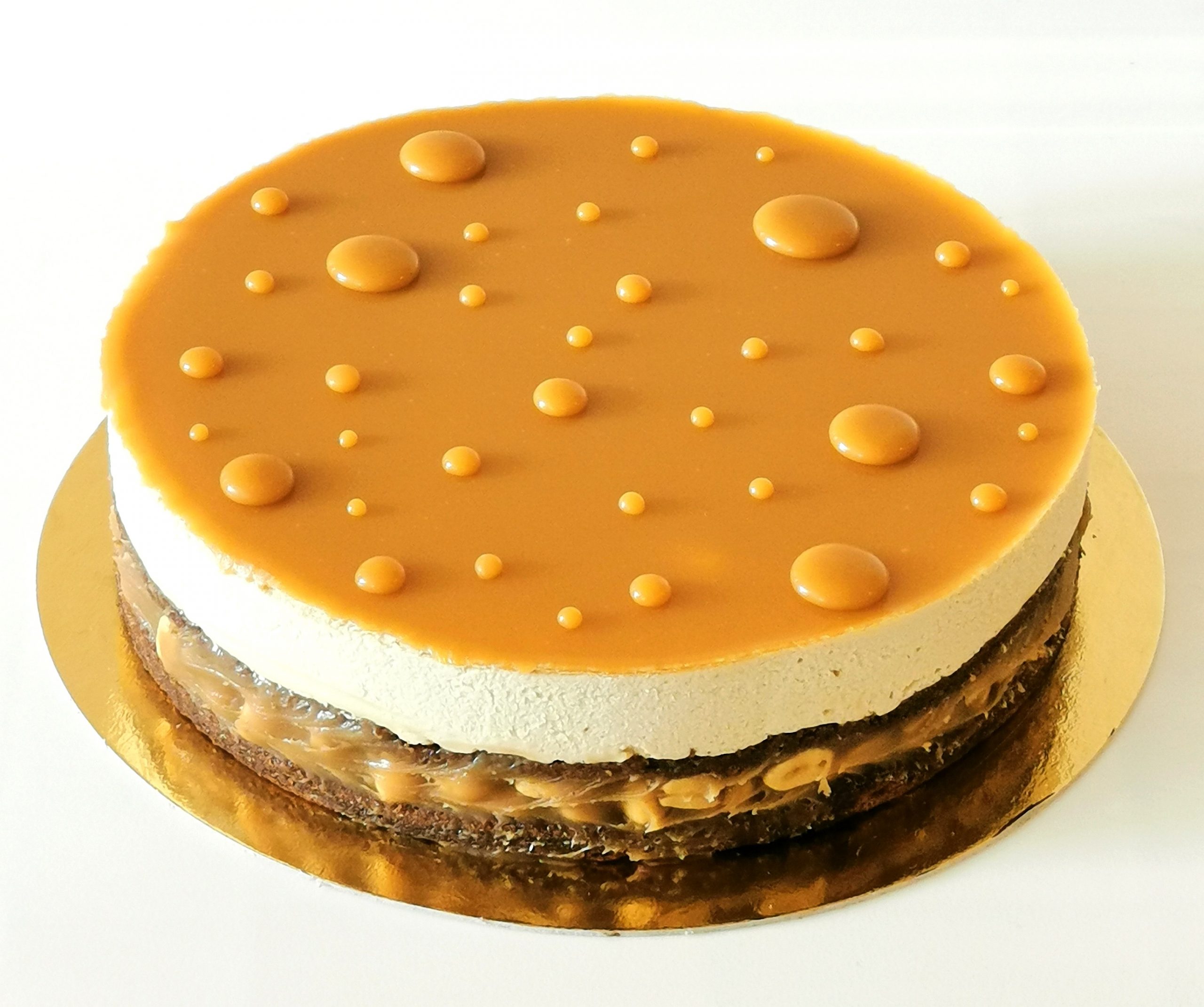 Un tort delicios cu două tipuri de mousse de ciocolată belgiană de cea mai bună calitate: mousse intens de ciocolată neagră și mousse onctuos și fin de ciocolată cu caramel.